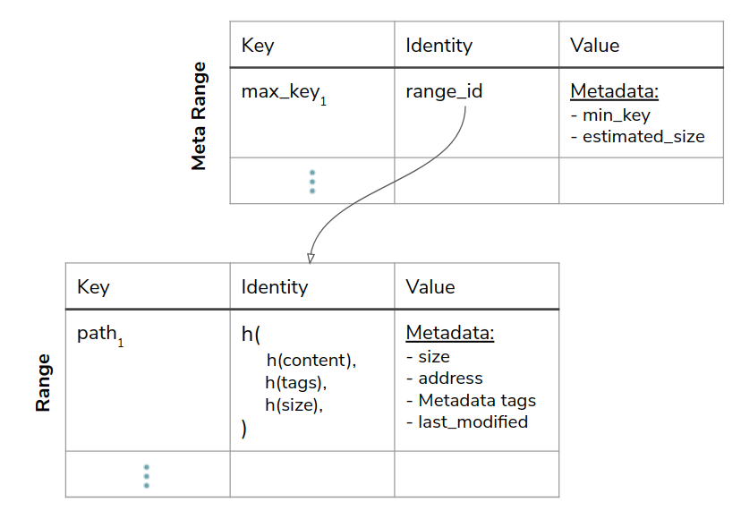 To support these requirements, we decided to essentially build a 2-layer Merkle tree composed of a set of leaf nodes ("Range") addressed by their content address, and a "Meta Range", which is a special range containing all ranges, thus representing an entire consistent view of the keyspace: